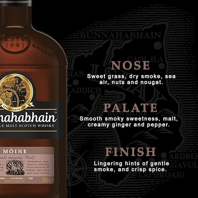 Crafted on the remote shores of Islay, Bunnahabhain Mòine is distilled using lightly peated malt, creating a whisky that is smoky yet refined, without overpowering the palate. Matured in a selection of high-quality oak casks, this single malt combines gentle peat smoke with sweet malt, sea breeze, warm spice, and a subtle briny character that reflects its maritime origins.
