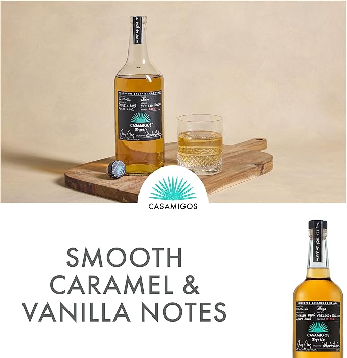 Casamigos Añejo Tequila boasts a deep amber color with warm golden highlights. The nose reveals aromas of caramel, vanilla, and roasted agave, complemented by subtle hints of cocoa and spice. On the palate, it is exceptionally smooth and balanced, featuring notes of butterscotch, toasted oak, and a gentle touch of pepper, finishing with a long, velvety, and slightly sweet aftertaste.