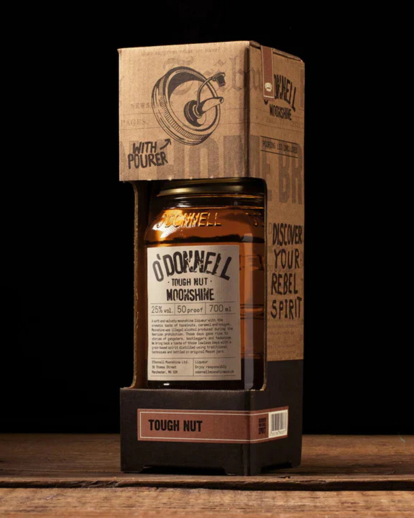 The Tough Nut from O’Donnell Moonshine is a premium 700 ml jar of hazelnut-flavoured liqueur, crafted in the UK. It offers a sweet-nutty profile, bottled at 25% ABV (i.e., 50 proof).